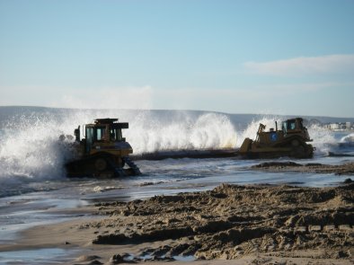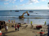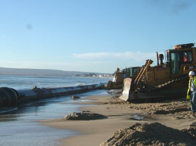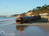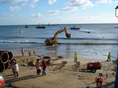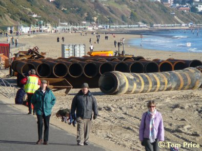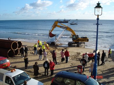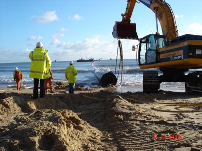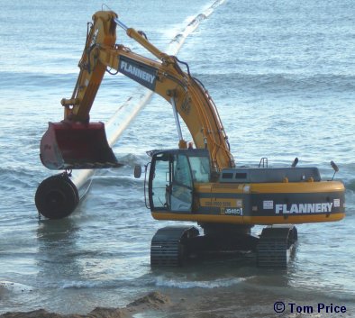 Bulldozers carefully manoeuvre the 1,150m pipeline offshore |