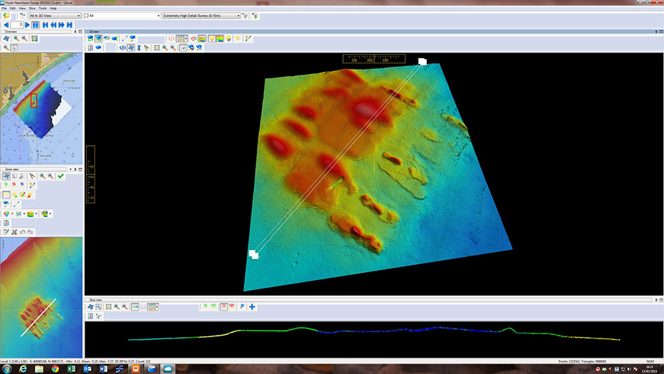 Below is a 3D image of the seabed generated by sonar (echo sounder) technology within the area we placed beach material; regular surveys will show us how the beach material has moved over time. Tracer searches and beach level surveys will help us understand where the material has moved to.